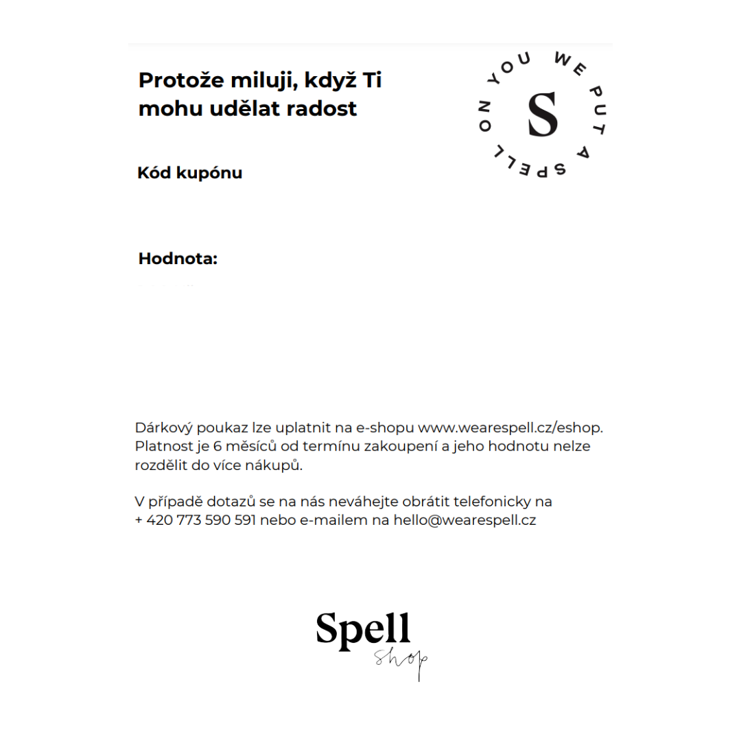 Dárkový poukaz má platnost 6 měsíců od data zakoupení a jeho hodnotu nelze rozdělit do více nákupů.